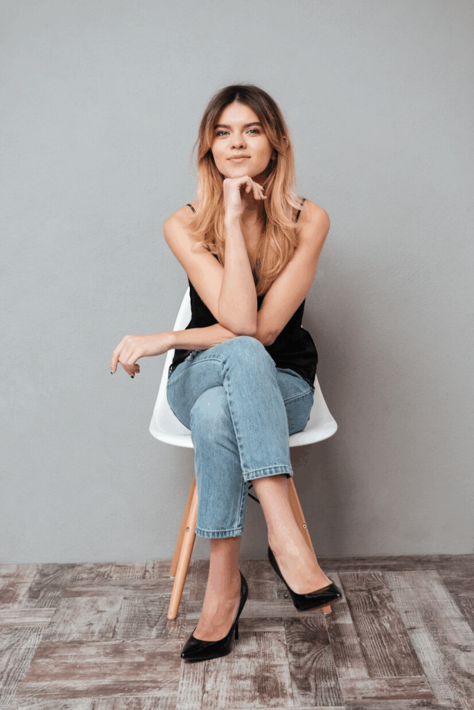 Rather than pointing your feet outward, you can create a refined look by crossing your legs and gently tucking them at an angle behind the chair legs.