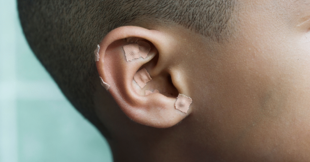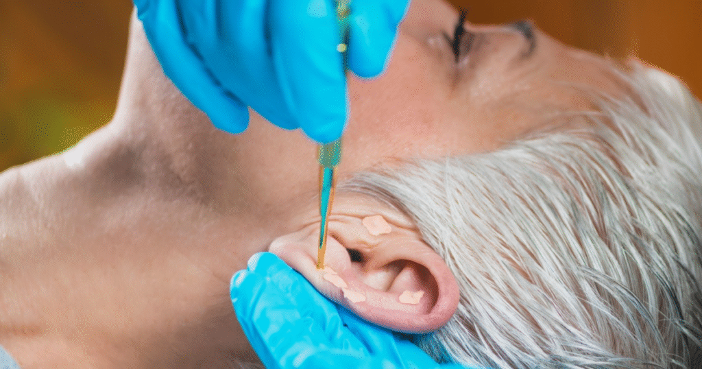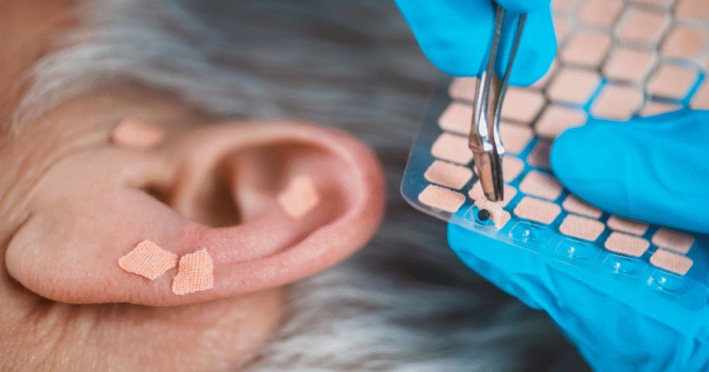 This traditional method is based on the idea that the ear mirrors the whole body, where different spots relate to various organs and systems. Rather than using needles, tiny adhesive patches with seeds or beads are applied to precise points on the ear’s surface.