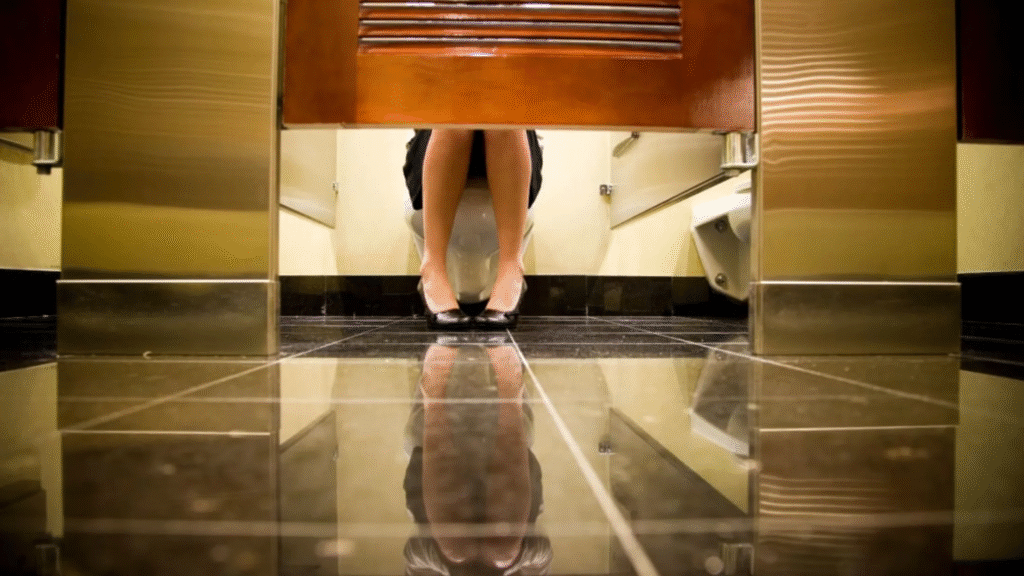 - Promoting Efficiency: The slightly awkward, incomplete privacy enforces the understanding that the space is communal and temporary. The visible feet are a constant, low-level reminder that the stall is in high demand, promoting quick use and discouraging loitering, which keeps the flow of the restroom moving efficiently during peak hours.